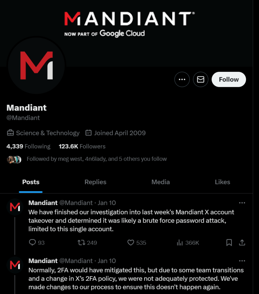 This implies Mandiant previously relied on SMS-based MFA for their X/Twitter account, and became exposed last year when X moved SMS-based MFA to paid-tier accounts only.